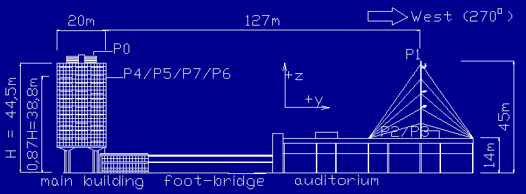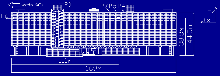 The driving rain measurements are carried out on the west façade of the Main Building, on the campus of the Eindhoven University of Technology (TUE). See fig. 1. Reference windspeed and rain intensity are measured on the roof of the Auditorium. The full-scale measurements started in December 1997 and went till January 2001.