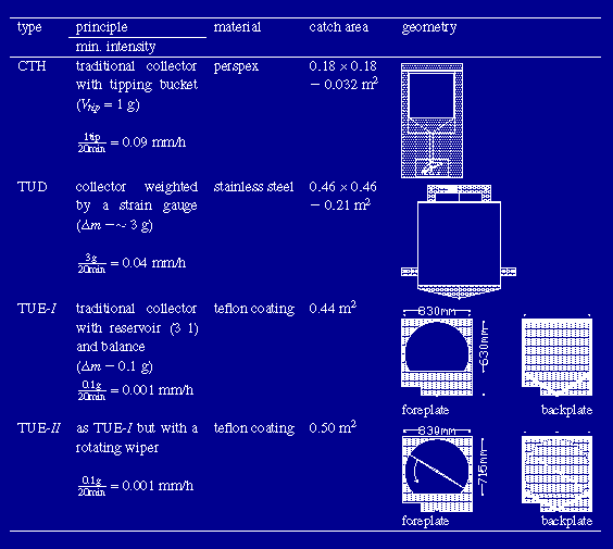 In collaboration with Anneli Högberg (Chalmers Tekniska Högskola, Göteborg) and Mikkel Kragh (Danmarks Tekniske Universitet, Lyngby), an international driving rain gauge test was set up in Eindhoven in July 1998. Everyone had developed his/her own device, according to different principles. The gauges involved in the comparison are listed and depictured in the table: